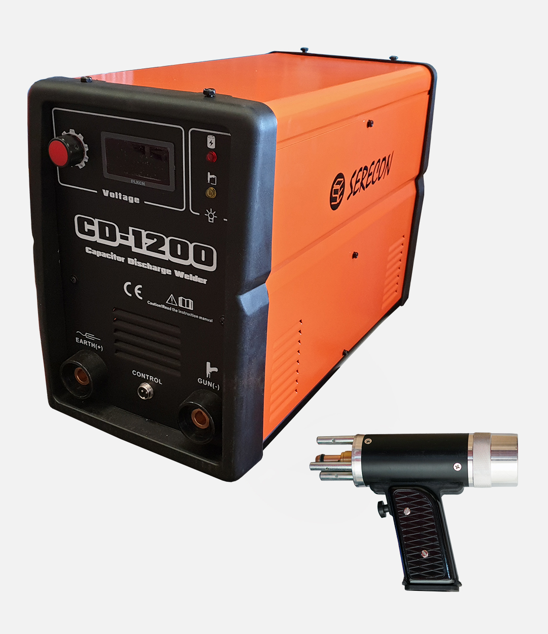 Máquina para soldadura de pernos. Los materiales del perno pueden ser acero blando, acero inoxidable, aluminio, titanio (Ti), latón y tornillo de cobre. El tiempo de soldadura de perno es de aproximadamente 3/1000s-6/1000s, el tiempo es muy corto, por lo que el calor de soldadura no puede dañar el metal base, incluso SI el metal base es de chapa metálica.